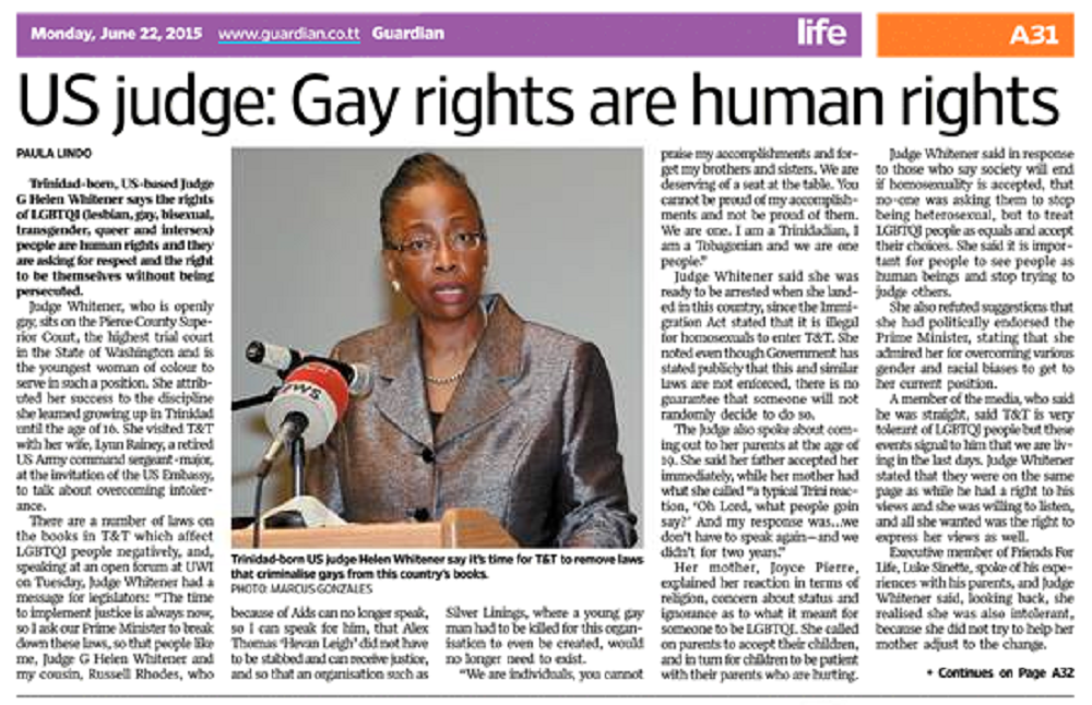 Judge Whitener, who is openly gay, sits on the Pierce County Superior Court, the highest trial court in the State of Washington and is the youngest woman of colour to serve in such a position. She attributed her success to the discipline she learned growing up in Trinidad until the age of 16. She visited T&T with her wife, Lynn Rainey, a retired US Army command sergeant major, at the invitation of the US Embassy, to talk about overcoming intolerance.