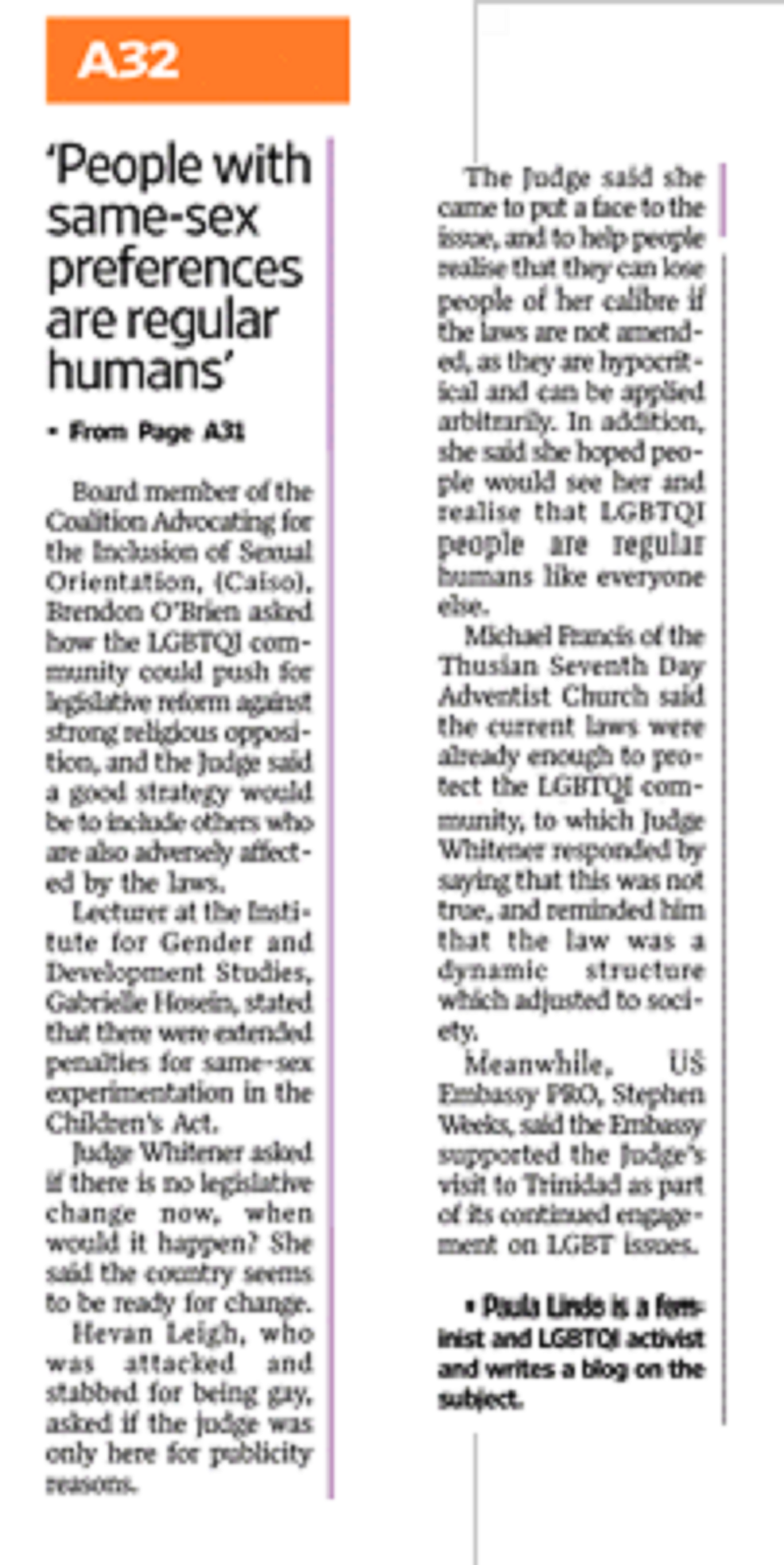 A member of the media, who said he was straight, said T&T is very tolerant of LGBTQI people but these events signal to him that we are living in the last days. Judge Whitener stated that they were on the same page as while he had a right to his views and she was willing to listen, and all she wanted was the right to express her views as well.
