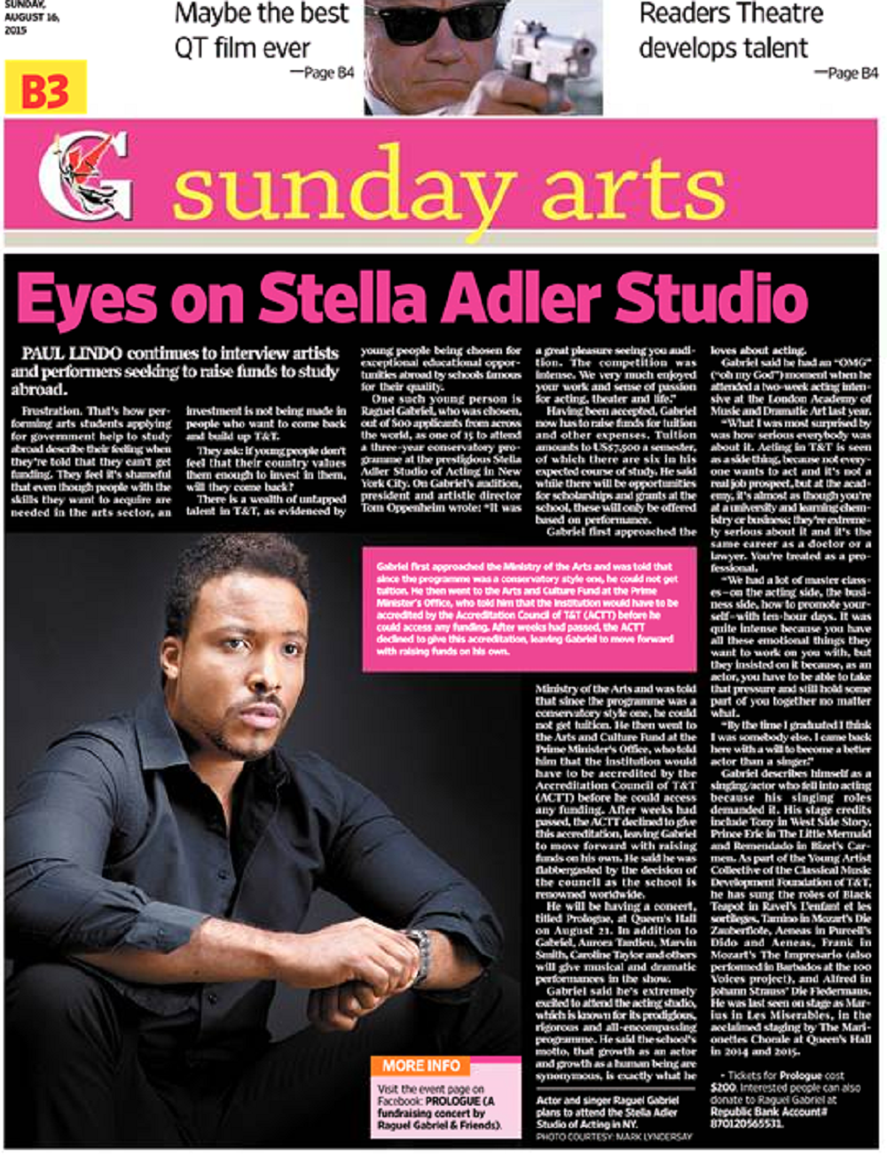 Gabriel said he had an OMG (oh my god) moment when he attended a two-week acting intensive at the London Academy of Music and Dramatic Art last year. “What I was most surprised by was how serious everybody was about it. Acting in T&T is seen as a side thing, because not everyone wants to act and it’s not a real job prospect, but at the Academy, it’s almost as though you’re at a University and learning Chemistry or Business, they’re extremely serious about it and it’s the same career as a doctor or a lawyer. You’re treated as a professional. We had a lot of master classes on the acting side, the business side, how to promote yourself, with 10-hour days. It was quite intense because you have all these emotional things they want to work on you with, but they insisted on it because, as an actor, you have to be able to take that pressure and still hold some part of you together no matter what. By the time I graduated I think I was somebody else. I came back here with a will to become a better actor than a singer.”