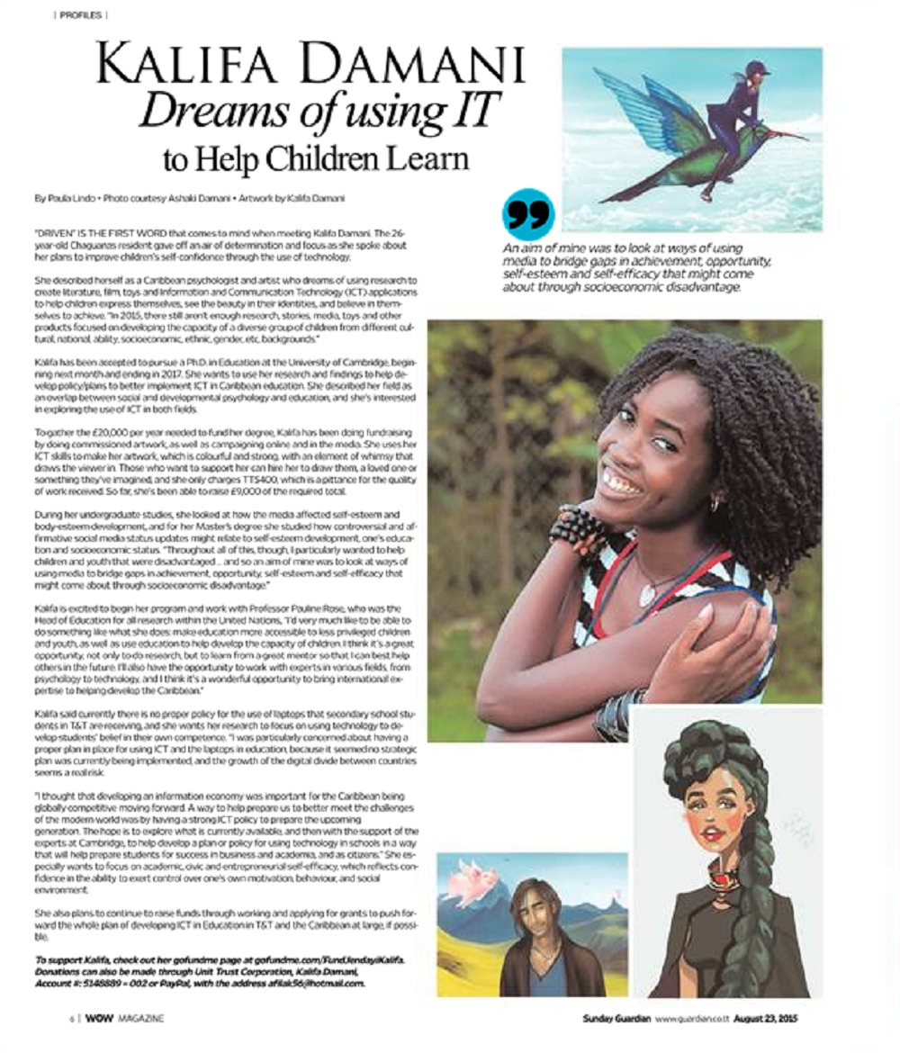 To gather the £20,000 per year needed to fund her degree, Damani has been doing fundraising by doing commissioned artwork, as well as campaigning online and in the media. She also plans to continue to raise funds through working and applying for grants to push forward the whole plan of developing ICT in Education in T&T and the Caribbean at large if possible.