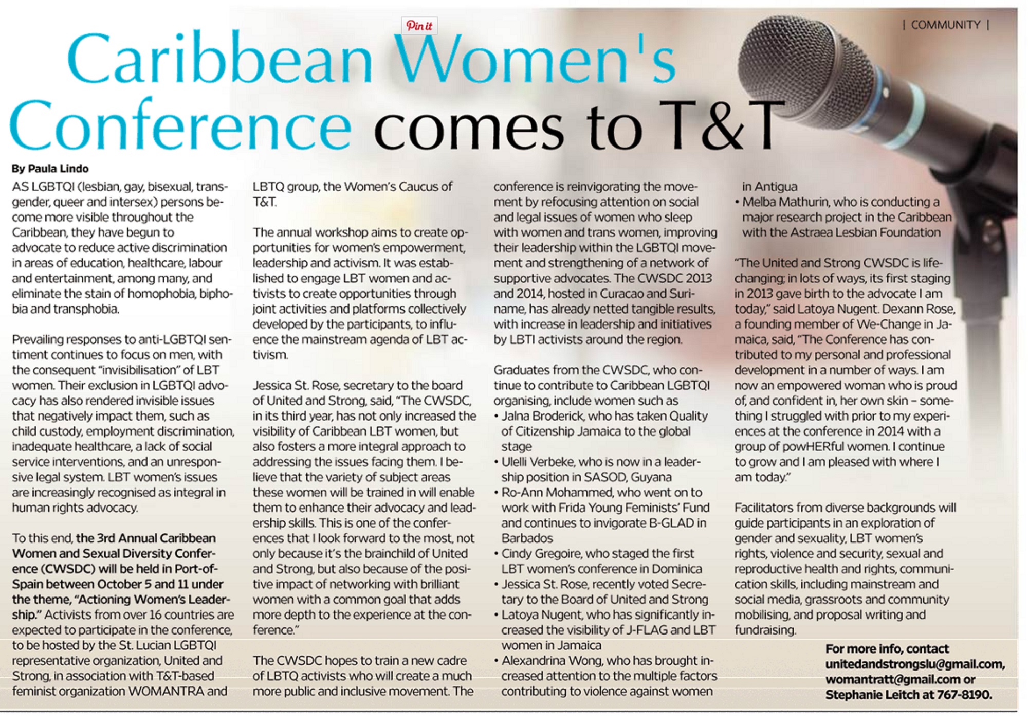 To this end, the 3rd Annual Caribbean Women and Sexual Diversity Conference (CWSDC) will be held in Port-of-Spain between October 5 and 11,2015, under the theme, “Actioning Women’s Leadership.” Activists from over 16 countries are expected to participate in the conference, to be hosted by the St. Lucian LGBTQI representative organization United and Strong in association with T&T-based feminist organization WOMANTRA and LBTQ group, the Women’s Caucus of T&T.
