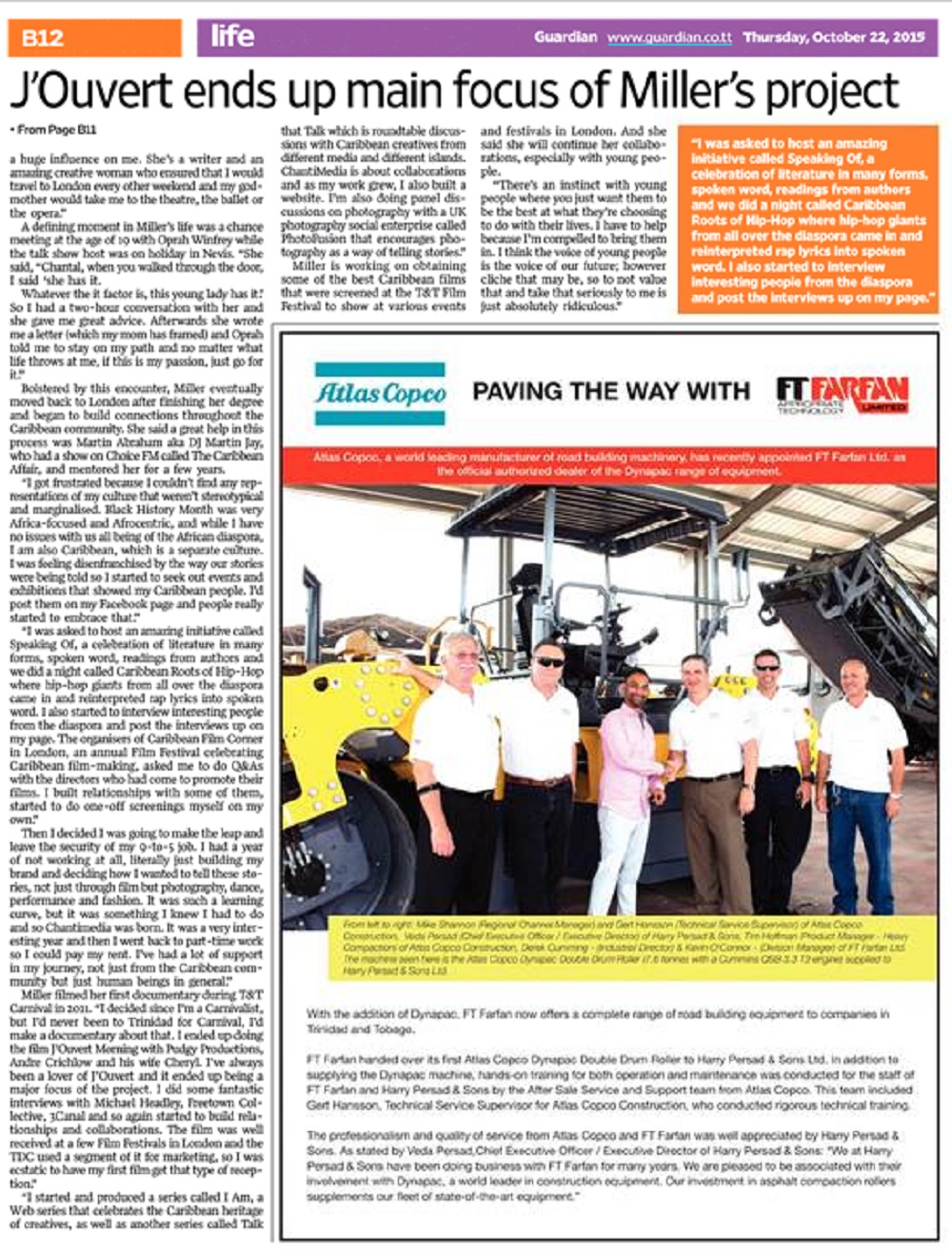 Miller filmed her first documentary in T&T during Carnival in 2011. “I decided that since I love Carnival and I’m a Carnivalist, but I’ve never been to Trinidad for Carnival, let me make a documentary about that. I connected with a director one year who was doing some work in Nevis and said I was going to Trinidad, I don’t have any money and I want to do a diary/documentary type thing of my first Carnival experience in Trinidad, do you want in? And he said, let’s do it. I did a Kickstarter to raise enough money to feed the crew and not much else, and so did this film “J’ouvert Morning” with Pudgy Productions, Andre Crichlow and his wife Cheryl. I’ve always been a lover of J’ouvert and it ended up being a major focus of the project. I did some fantastic interviews with Michael Headley, Freetown Collective, 3Canal and so again started to forge and build relationships and collaborations from that experience as well. The film showed at a few Film Festivals in London and it was well received and the TDC used a segment of it for marketing, so I was ecstatic to have my first film have that type of reception.”