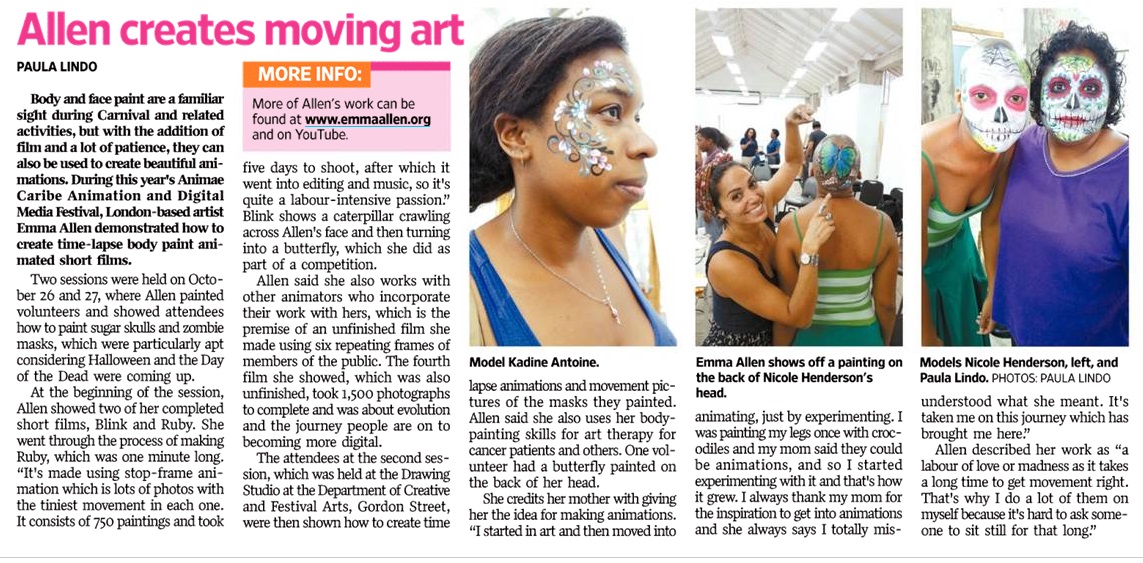 During this year’s Animae Caribe (AC) Animation and Digital Media Festival, London-based artist Emma Allen demonstrated how to create timelapse body paint animated short films.