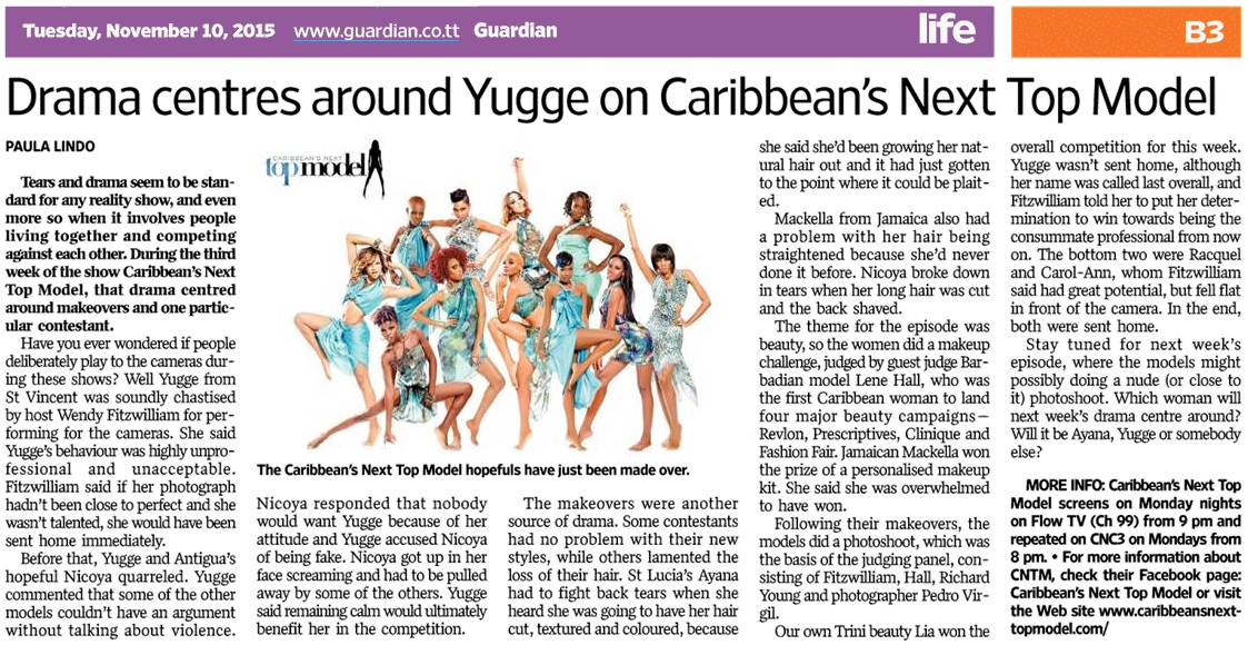 Lia (T&T) won the overall competition for this week. Yugge wasn’t sent home, although her name was called last overall, and Fitzwilliam told her to put her determination to win towards being the consummate professional from now on. The bottom two were Racquel and Carol-Ann, whom Fitzwilliam said had great potential, but fell flat in front of the camera. In the end, both women were sent home.