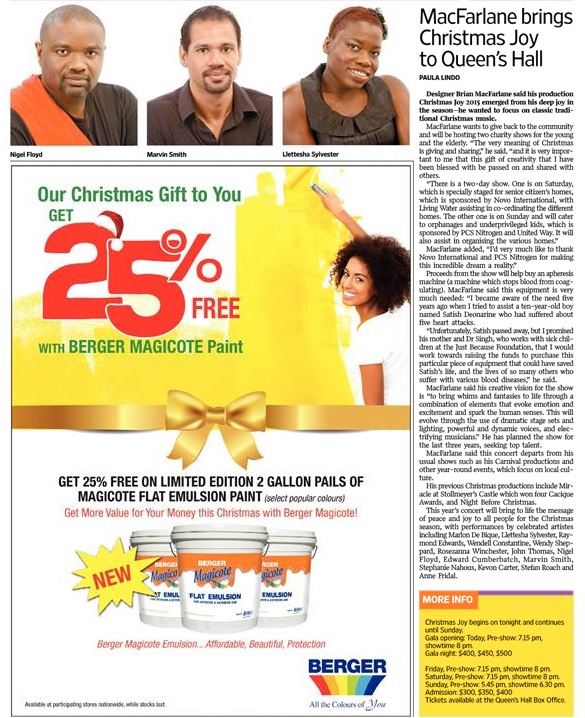 The concert will bring to life the message of peace and joy to all people for the Christmas season, with 25 performances by celebrated artistes including Marlon De Bique, Llettesha Sylvester, Raymond Edwards, Wendell Constantine, Wendy Sheppard, Rosezanna Winchester, John Thomas, Nigel Floyd, Edward Cumberbatch, Marvin Smith, Stephanie Nahous, Kevon Carter, Stefan Roach and Anne Fridal.