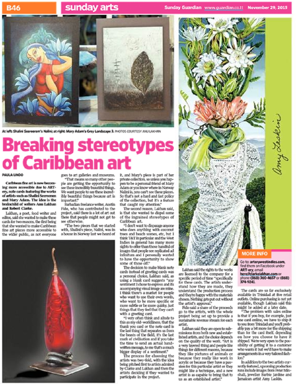Caribbean fine art is now becoming more accessible due to ART-ery, note cards featuring the works of noted artists such as Shalini Seereeram and Mary Adam. The idea is the brainchild of Anu Lakhan and Robert Clarke.