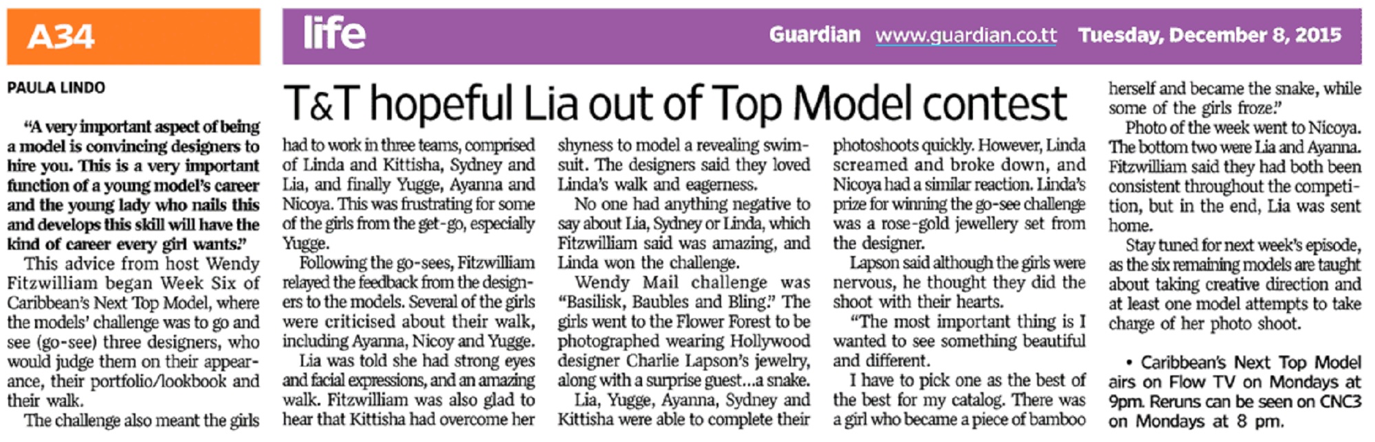 Photo of the week went to Nicoya, followed by Kittisha, Sydney, Yugge and Linda. The bottom two were Lia and Ayanna. Fitzwilliam said they had both been consistent throughout the competition, but in the end, Lia was sent home.
