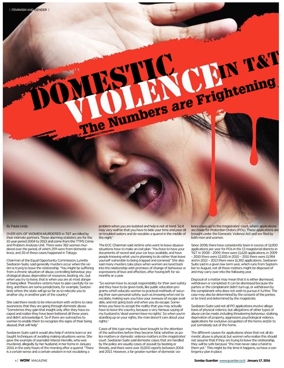 Before murder occurs, cases of this type would have been brought to the attention of the authorities before they became fatal, whether as police matters or domestic violence matters in the magistrates’ court. Seebaran-Suite said domestic cases which are handled by the police are usually cases of assaults by beating or threats, and there were over 15,000 reports between 2004 and 2013. However, a far greater number of domestic violence cases go to the magistrates’ court where applications are made for Protection Orders (POs). These applications are brought under the Domestic Violence Act and are filed by both men and women.