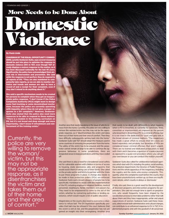 Chairman of the Equal Opportunities Commission, Lynette Seebaran-Suite, says there are several measures which need to be put into place to optimize the response to domestic violence (DV) in T&T. She said these measures are needed even though T&T already displays a mature response to DV, in that the topic is discussed on a national level and has been for the last 40 years.