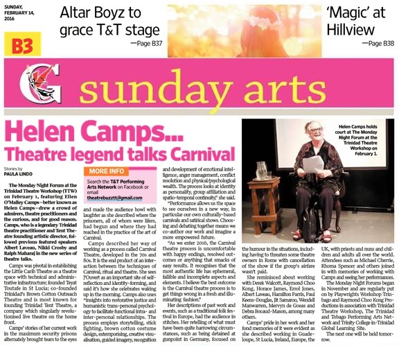 The Monday Night Forums are put on by Playwrights Workshop Trinbago and Raymond Choo Kong Productions in association with Trinidad Theatre Workshop, The Trinidad and Tobago Performing Arts Network and Trinity College in-Trinidad Global Learning Site. The next one will be held on February 15, 2016. Interested persons can find the event on Facebook at the Trinidad and Tobago Performing Arts Network or email theatrebuzztt@gmail.com.