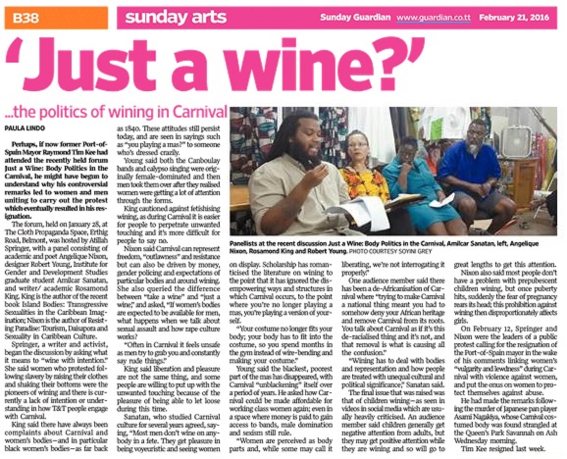 Springer began the discussion by asking what it means to wine with intention. She said women who protested following slavery by raising their clothes and shaking their bottoms were the pioneers of wining and there is currently a lack of intention or understanding in how Trinbagonians engage with Carnival.