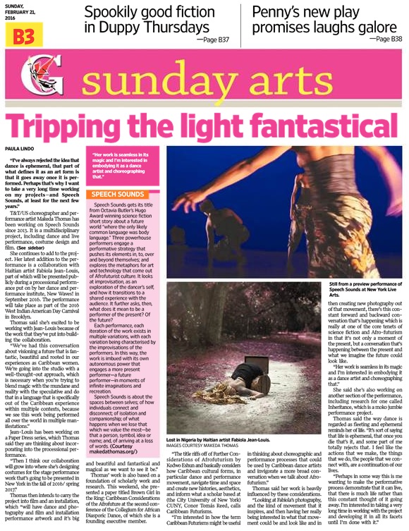 Thomas’ work is also based on a foundation of scholarly work and research. This weekend, she presented a paper titled “Brown Girl in the Ring: Caribbean Considerations of the Afrofuture” at the second conference of the Collegium for African Diasporic Dance, of which she is a founding member. “The title riffs off of further considerations of Afro-futurism by Kodwo Eshun and basically considers how Caribbean cultural forms, in particular dance and performance movement navigate time and space and create new histories, aesthetics, and inform what a scholar based at CUNY, Conor Tomás Reed, calls “Caribbean futurism. I’m interested in how the term Caribbean Futurisms might be useful in thinking about choreographic and performance processes that could be used by Caribbean dance artists and invigorate more broad conversation when we talk about Afro-futurism.”