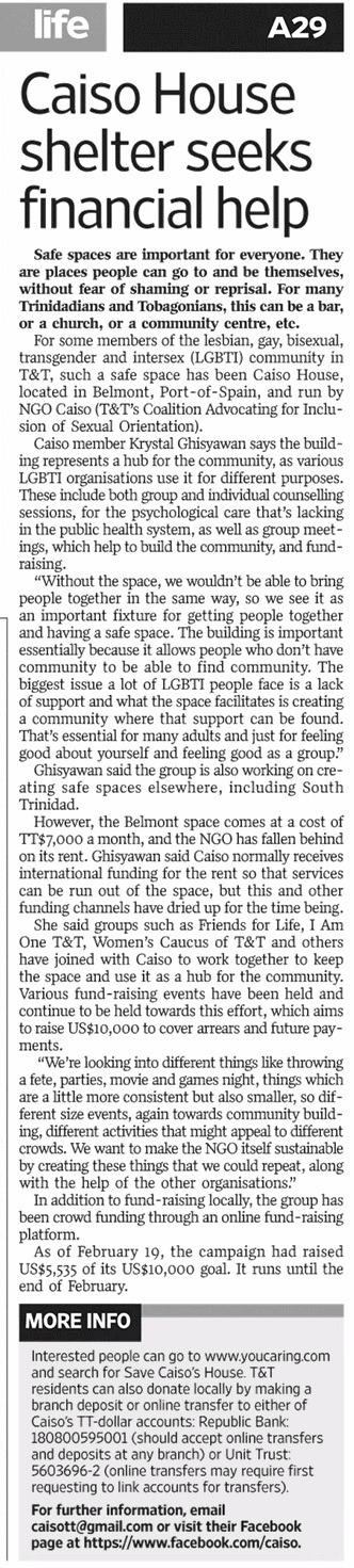 Interested persons can go to http://www.youcaring.com and search for “Save CAISO’s House.” T&T residents can also donate locally by making a branch deposit or online transfer to either of CAISO’s TT dollar accounts: Republic Bank: 180800595001 (should accept online transfers and deposits at any branch) or Unit Trust: 5603696-2 (online transfers may require first requesting to link accounts for transfers). For further information, email caisott@gmail.com or visit their Facebook page at https://www.facebook.com/caiso.