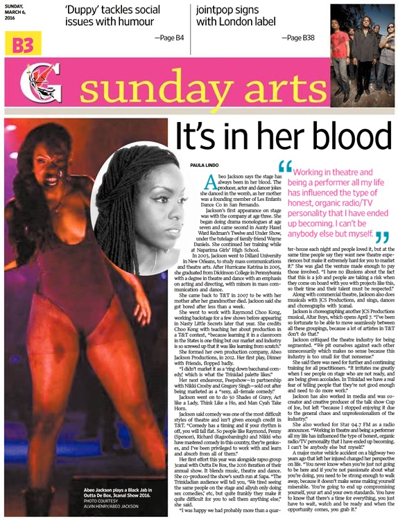 Producer/actress/dancer Abeo Jackson says the stage has always been in her blood, and jokes she danced in the womb, as her mother was a founding member of Les Enfants Dance Company in San Fernando.