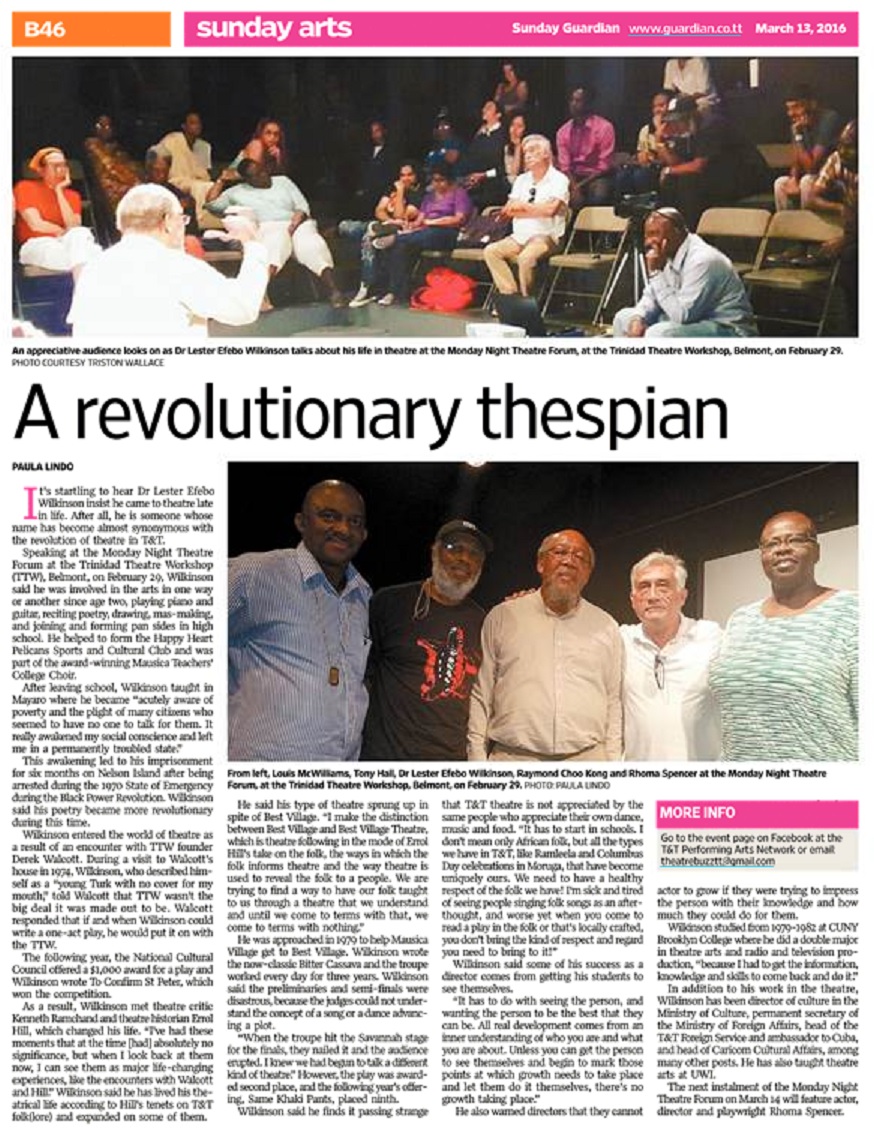 Speaking at the Monday Night Theatre Forum at the Trinidad Theatre Workshop (TTW) on February 29, Wilkinson said he was involved in the Arts in one way or another since age two, playing piano and guitar, reciting poetry, drawing, mas-making, and joining and forming pan sides in high school. He helped to form the Happy Heart Pelicans Sports and Cultural Club and was part of the award-winning Mausica Teachers’ College Choir.