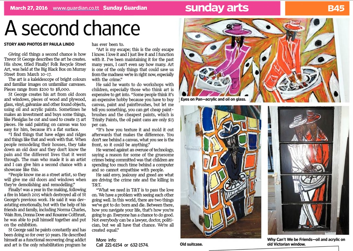 Finally! was a year in the making, following a fire in March 2015 which destroyed all of St. George’s previous work. He said it was devastating emotionally, but with the help of his friends and family, including Norma Charles, Wain Iton, Donna Dove and Roxanne Colthrust, he was able to pull himself together and put on the exhibition.
