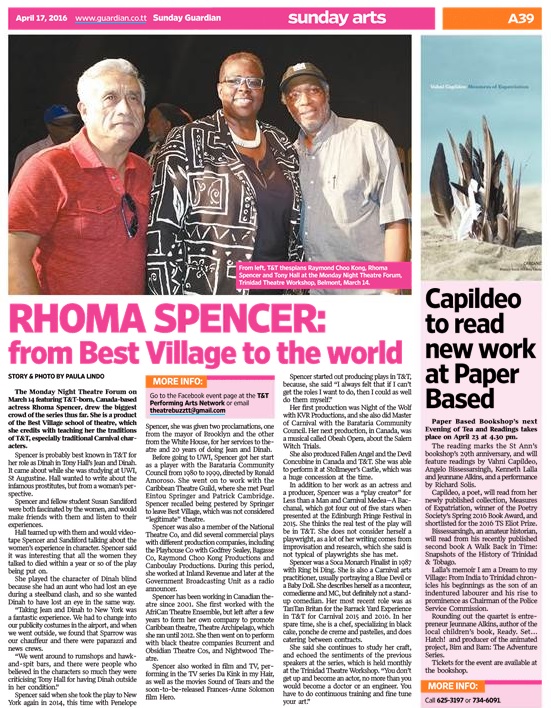The Monday Night Theatre Forum on March 14, featuring T&T-born, Canada-based actress Rhoma Spencer, drew the biggest crowd of the series thus far. She is a product of the Best Village school of theatre, which she credits with teaching her the traditions of T&T, especially traditional Carnival characters.