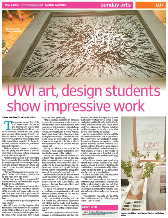 The opening of the UWI Department of Creative and Festival Arts (DCFA) Fine Arts and Design Exhibition 2016 at the National Museum and Art Gallery of T&T drew upwards of one hundred people. Exhibits were presented by 22 Fine Arts students and 17 design students, exploring issues ranging from child sexual abuse to anxiety to the environment and areas such as food, traditional mas and education.