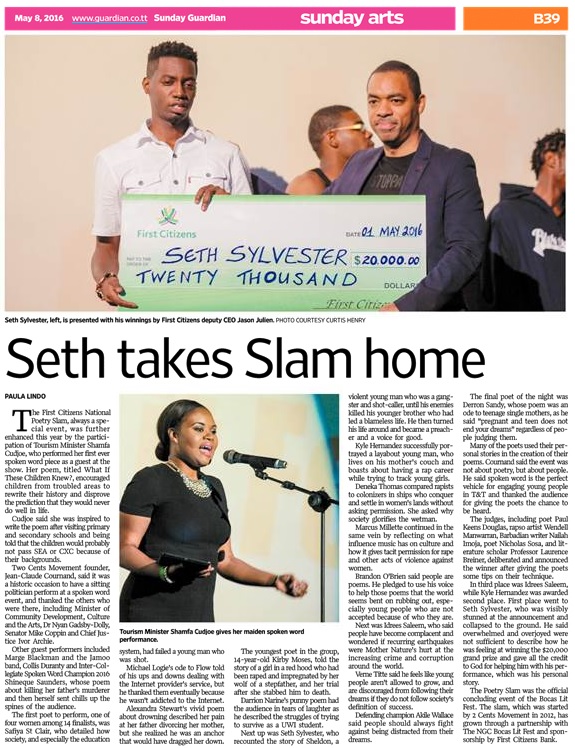Two Cents Movement founder, Jean-Claude Cournand, said it was a historic occasion to have a sitting politician perform at a Spoken Word event, and thanked the others who were there, including Minister of Arts and Community Development Dr. Nyan Gadsby-Dolly, Senator Mike Coppin and Chief Justice Ivor Archie. The Two Cents Movement organized the Slam along with the Festival and with the sponsorship of First Citizens Bank.