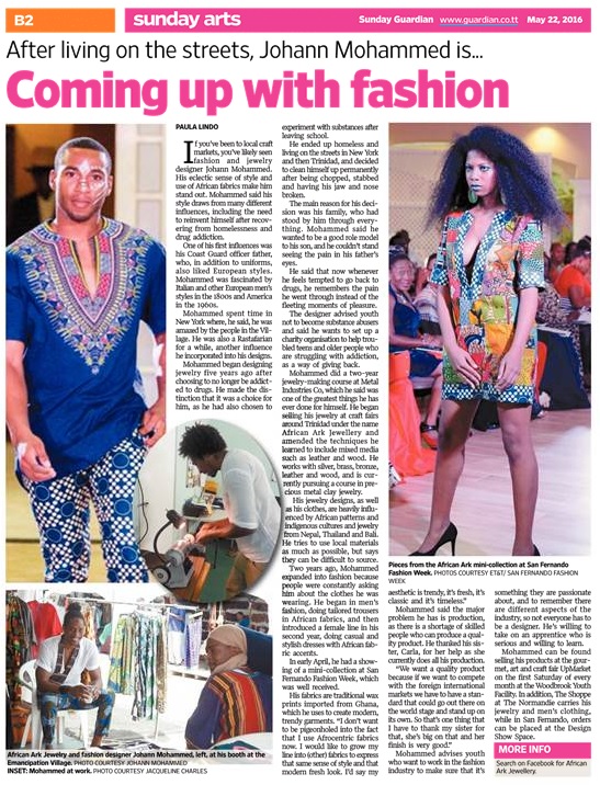 Mohammed can be found at UpMarket on the first Saturday of every month, selling his products. In addition, The Shoppe at the Normandie Hotel carries his jewellery and men’s clothing, while in San Fernando, orders can be placed at The Design Space, which was set up by the organizers of San Fernando Fashion Week.
