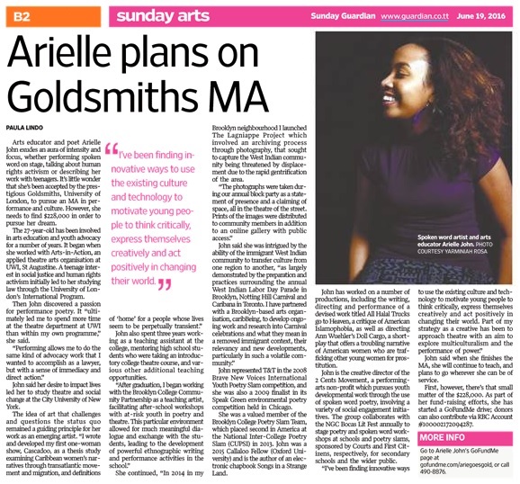 Art educator and poet Arielle John exudes an aura of intensity and focus, whether performing Spoken Word on stage, talking about human rights activism or her work with teenagers. It’s little wonder that she’s been accepted by the prestigious Goldsmith University, University of London, to pursue a Masters of Arts (MA) in Performance and Culture. However, she needs to find TT$228,000 in order to pursue her dream.