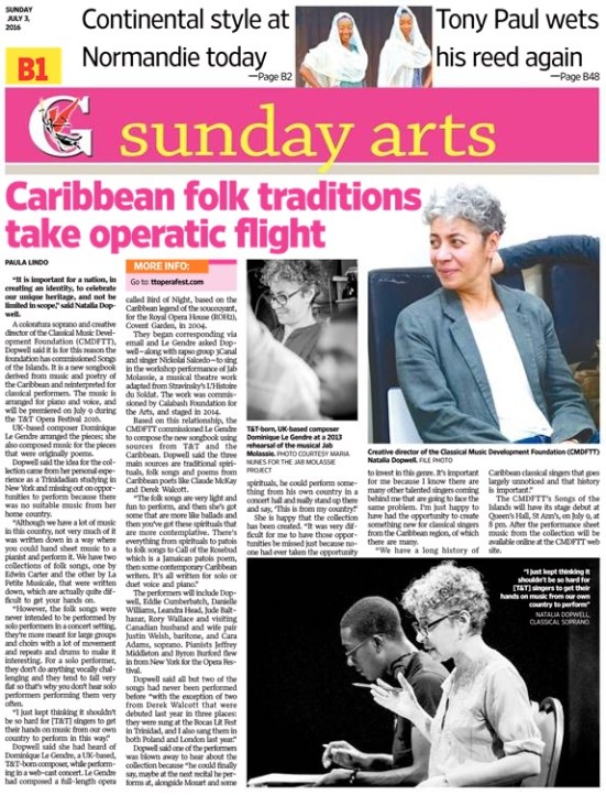 Dopwell said she heard of Dominique LeGendre, a UK-based, Trinidad-born composer, while performing in a web-cast concert. LeGendre had composed a full-length opera, called “Bird of Night,” based on the Soucouyant, for the Royal Opera House, (ROH2) Covent Garden, in 2004. They began corresponding via email and LeGendre asked Dopwell with rapso group 3Canal and singer Nickolai Salcedo to sing in the workshop performance of “Jab Molassie,” a new music-theatre work commissioned by Calabash Foundation for the Arts, in 2014.