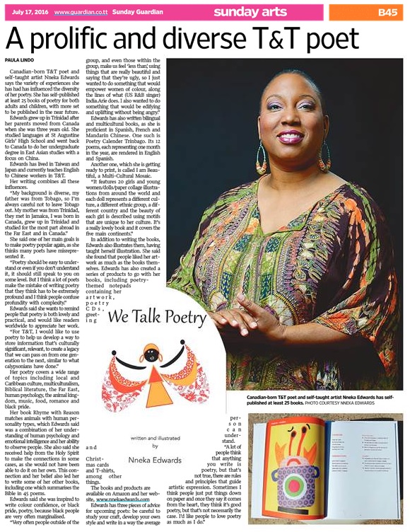 Canadian-born Trinbagonian poet and self-taught artist Nneka Edwards says the variety of experiences she has had has influenced the diversity of her poetry. She has self-published at least 25 books of poetry for both adults and children, with more set to be published in the near future.