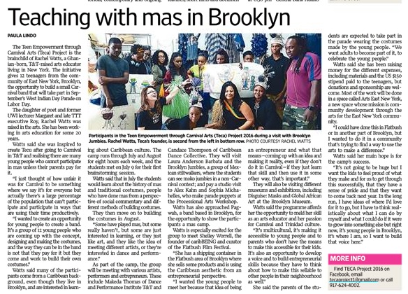 The Teen Empowerment through Carnival Arts (TECA) Project is the brainchild of Rachel Watts, a Ghanian-born, T&T-raised arts educator currently living in New York. The initiative gives 12 teenagers from the community of East New York Brooklyn the opportunity to build a small Carnival band which will take part in September’s West Indian Day Parade on Labor Day.