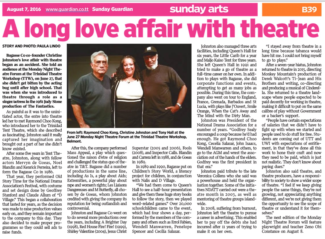 Johnston was President of the National Drama Association of T&T for a number of years. “Godfrey Sealy encouraged a coup because he’d had enough. He got Raymond Choo Kong, Cecelia Salazar, John Isaacs, Wendell Manwarren and others, to go to the AGM and wrest the Association out of the hands of the elders. Godfrey was the first President in that era.” Johnston paid tribute to Veronica Collins who she said was a powerhouse and held the organization together. Some of the initiatives NDATT carried out were a theatre month in 2003, as well as mentoring of theatre groups island-wide.