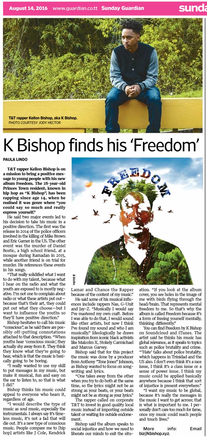 T&T rapper Kellon Bishop is on a mission to bring a positive message to young people with his new album, Freedom. The 28-year-old Princes Town resident has been rapping since age 14, when he realized it was genre where “you could say so much and really express yourself.”