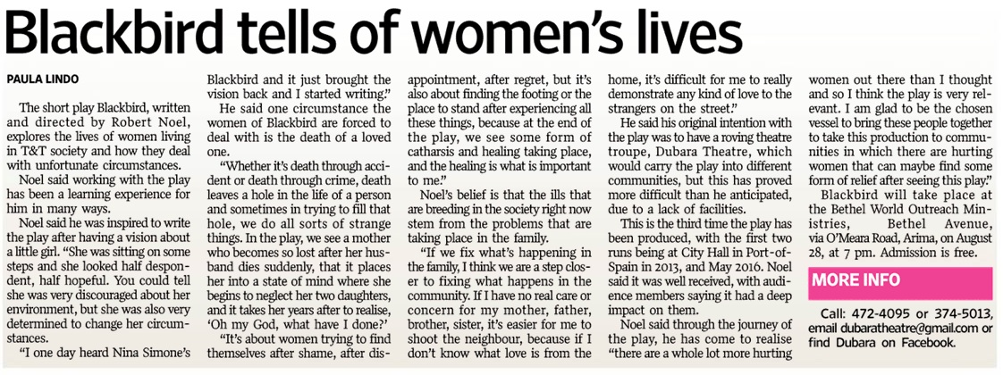 The short play Blackbird, written and directed by Robert Noel, explores the lives of women living in T&T society and how they deal with unfortunate circumstances. He said working with the play has been a learning experience for him in many ways.
