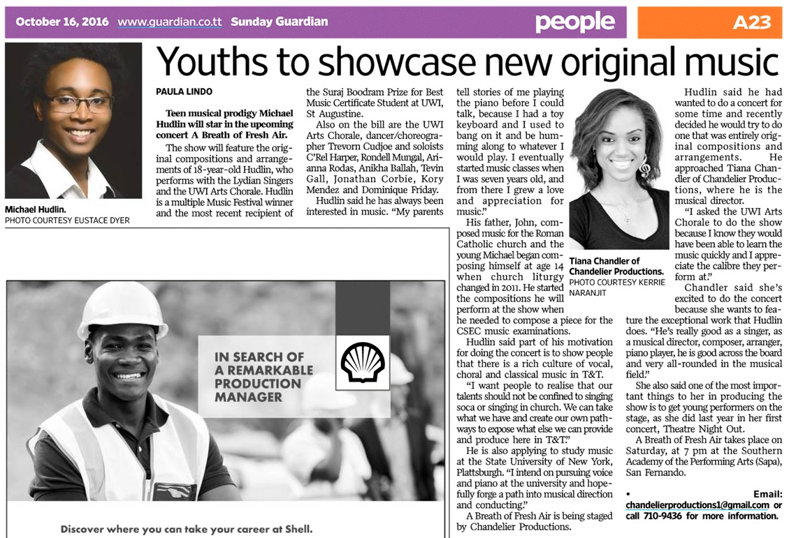 She also said one of the most important things to her in producing the show is to get young performers on the stage, as she did last year in her first concert, “Theatre Night Out.” She said while there are a lot of well-known arts practitioners in T&T, there is also a lot of less well-known talent as well. “A lot of them don’t get as many opportunities or they’re not as seen or heard as some others, so that is really something I want to do. The people performing the work are young, some of the instrumentalists are also young, and it’s really exciting for me to pull all these very young, very talented people together. What motivates me is seeing all these people my age and younger, doing so much good work in the performing arts and having the opportunity to put them on stage to put on a concert that I think that the country needs to see. As the title says “A Breath of Fresh Air,” it’s new music, it’s new talent, people should want to hear what the music sounds like and it really is something they should come out to see and support.”