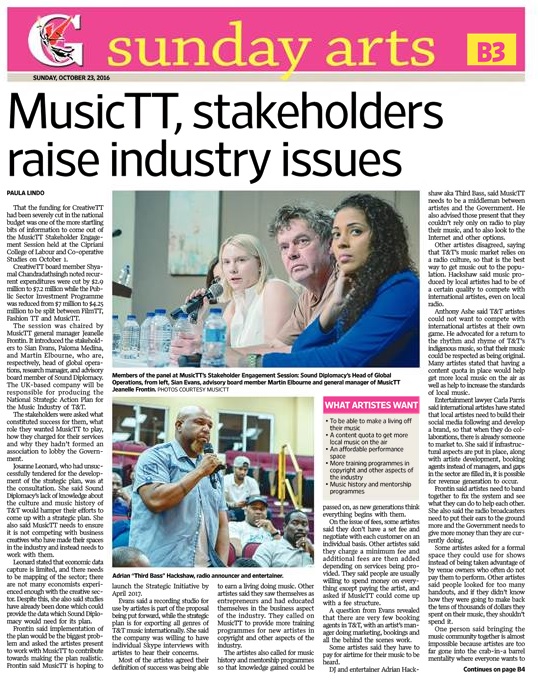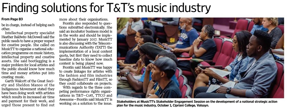 Frontin also responded to questions which were submitted electronically. She said an incubator business model is in the works and should be implemented by January 2017. MusicTT is also discussing with TATT the implementation of a local content quota, but first they need to collect baseline data to know how much content is being played now. Frontin said MusicTT was happy to create linkages for artists with the fashion and film industries through FashionTT and FilmTT, so they can collaborate on projects. With regards to the three copyright companies in T&T – COTT, TTCO and Awesome – Frontin said MUSICTT is working on a solution to the issue. She said implementation of the plan will be the biggest problem and asked the artists present to work with MusicTT to contribute towards making the plan realistic. Frontin said MusicTT is hoping to launch the Strategic Initiative by April 2017.