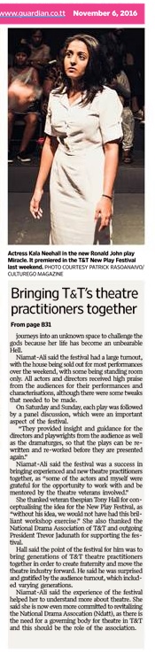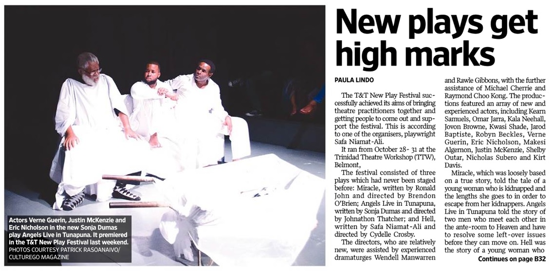 The Festival consisted of three plays which had never been staged before: Miracle, written by Ronald John and directed by Brendon O’Brien; Angels Live in Tunapuna, written by Sonja Dumas and directed by Johnathon Thatcher; and Hell, written by Safa Niamat-Ali and directed by Cydelle Crosby.
