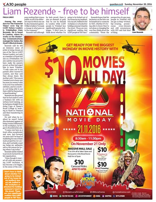 Among the awardees for The Financial Times’ 2016 Top 50 LGBT Future Leaders is Trinidadian Liam Rezende. He is based in London, where he works as the Marketing Communications Manager for Andaz, the Hyatt’s lifestyle brand. Rezende said he felt an immense sense of pride in being chosen as one of the Top 50 LGBT Future Leaders, not only as a member of Hyatt but also as a Trinidadian.