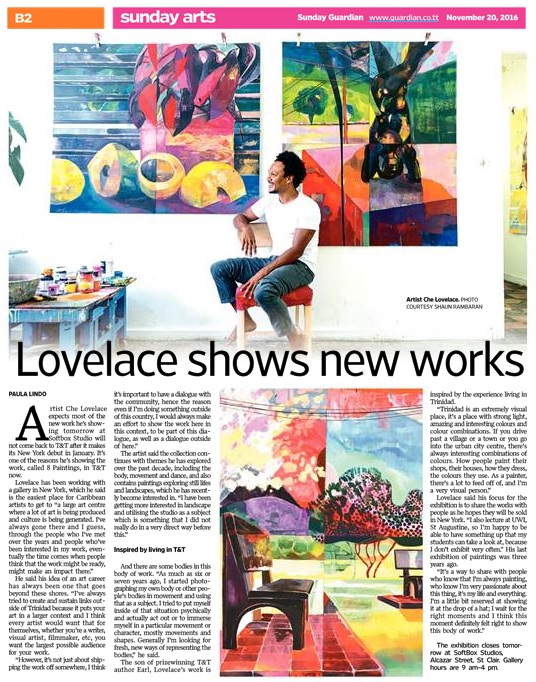 Artist Che Lovelace said his upcoming exhibition is a sharing of the work he has recently created with the T&T public before he exhibits the collection in New York, as he expects most of it will not come back.