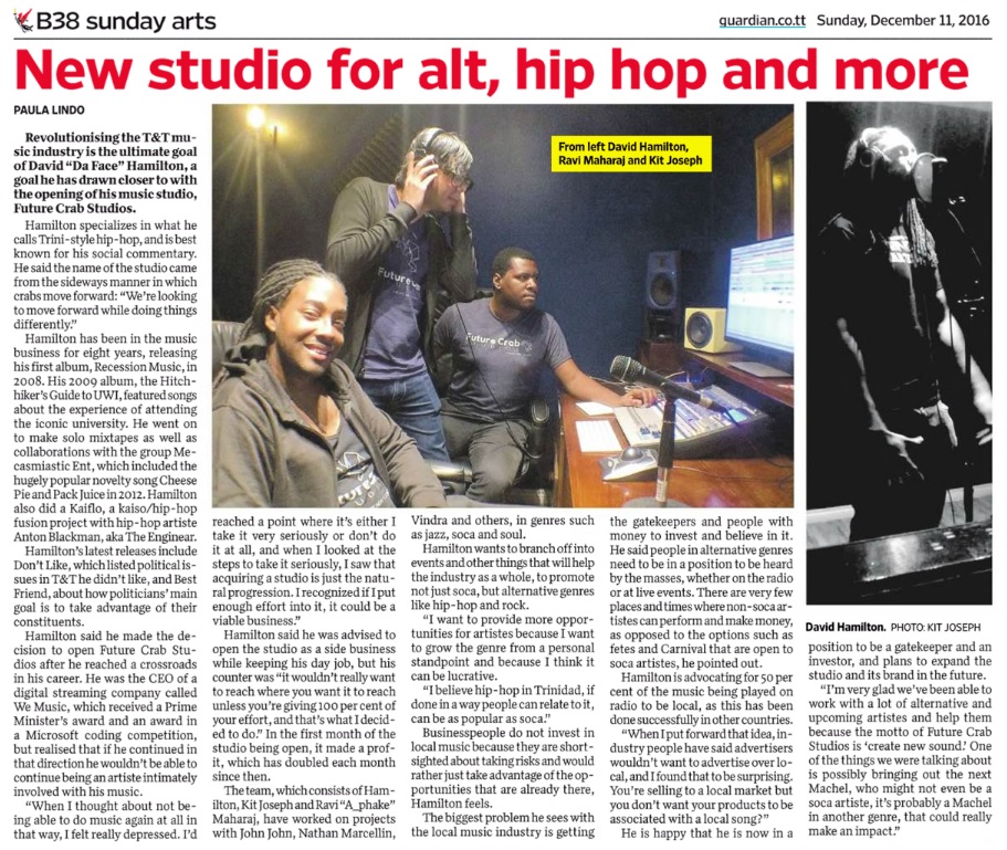 Revolutionizing the T&T music industry is the ultimate goal of David “Da Face” Hamilton, a goal he has drawn closer to with the opening of his music studio, Future Crab Studios.