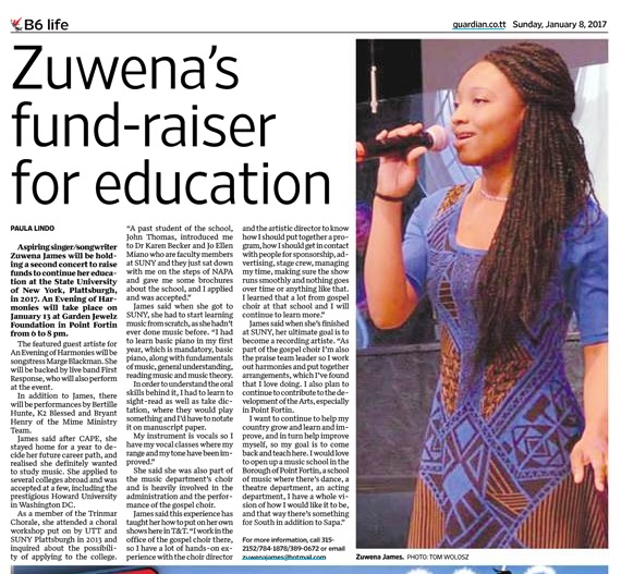 Aspiring singer/songwriter Zuwena James will be holding a second concert to raise funds to continue her education at the State University of New York, Plattsburgh, in 2017. “An Evening of Harmonies” will take place on January 13 at Garden Jewelz Foundation in Point Fortin from 6 to 8 pm.