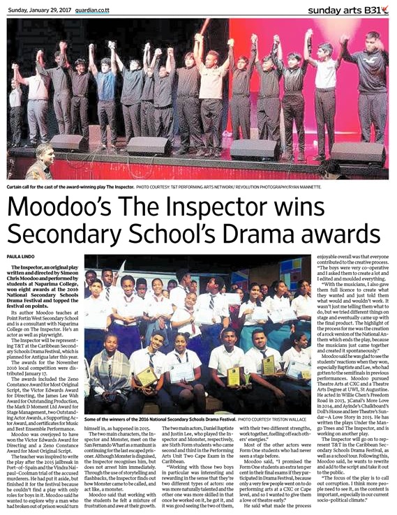 The Inspector, an original play written and directed by Simeon Moodoo and performed by students at Naparima College, won eight awards at the National Secondary Schools Drama Festival and will be representing T&T at the Caribbean Secondary Schools Drama Festival.
