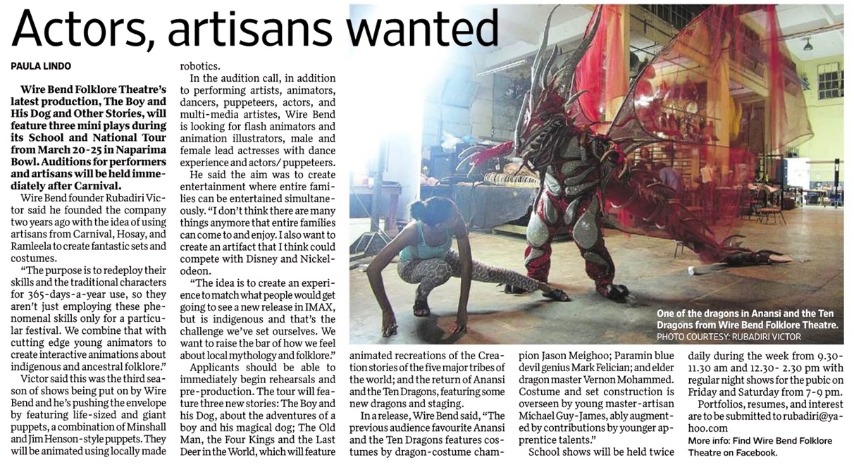 Applicants should be able to immediately begin rehearsals and pre-production. The tour will feature three new stories: ‘The Boy and his Dog’- about the adventures of a boy and his magical dog; ‘The Old Man, the Four Kings and the Last Deer in the World’ which will feature animated recreations of the Creation stories of the five major tribes of the world; and the return of ‘Anansi and the 10 Dragons’ featuring some new Dragons and staging. In a release, Wire Bend said “The previous audience favourite ‘Anansi and the 10 Dragons’ features costumes by dragon-costume champion Jason Meighoo; Paramin blue devil genius Mark Felician; and Elder dragon Master Vernon Mohammed. Costume and set construction is overseen by young Master-artisan Michael Guy-James, ably augmented by contributions by younger apprentice talents.” School shows will be held twice daily during the week from 9:30 to 11:30 am and 12:30 to 2:30 pm with regular night shows for the pubic on Friday and Saturday from 7 to 9 pm.