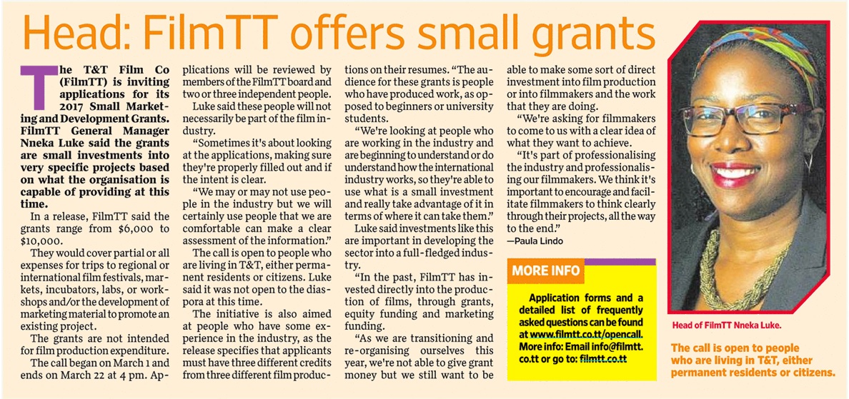 The T&T Film Company (FilmTT) is inviting applications for its 2017 Small Marketing and Development Grants.