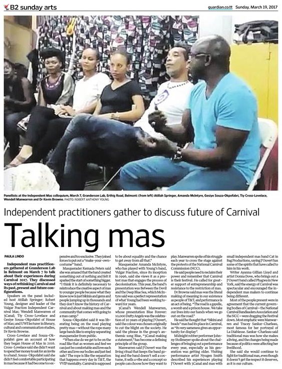 Independent mas practitioners gathered at Granderson Lab in Belmont on March 7 to talk about their experiences during Carnival. They discussed ways of rethinking Carnival and its past, present and future configurations.