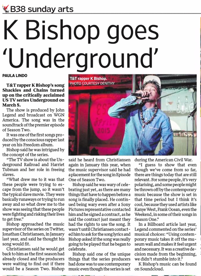 T&T rapper K Bishop’s song Shackles and Chains turned up on the critically acclaimed US TV series Underground on March 8.