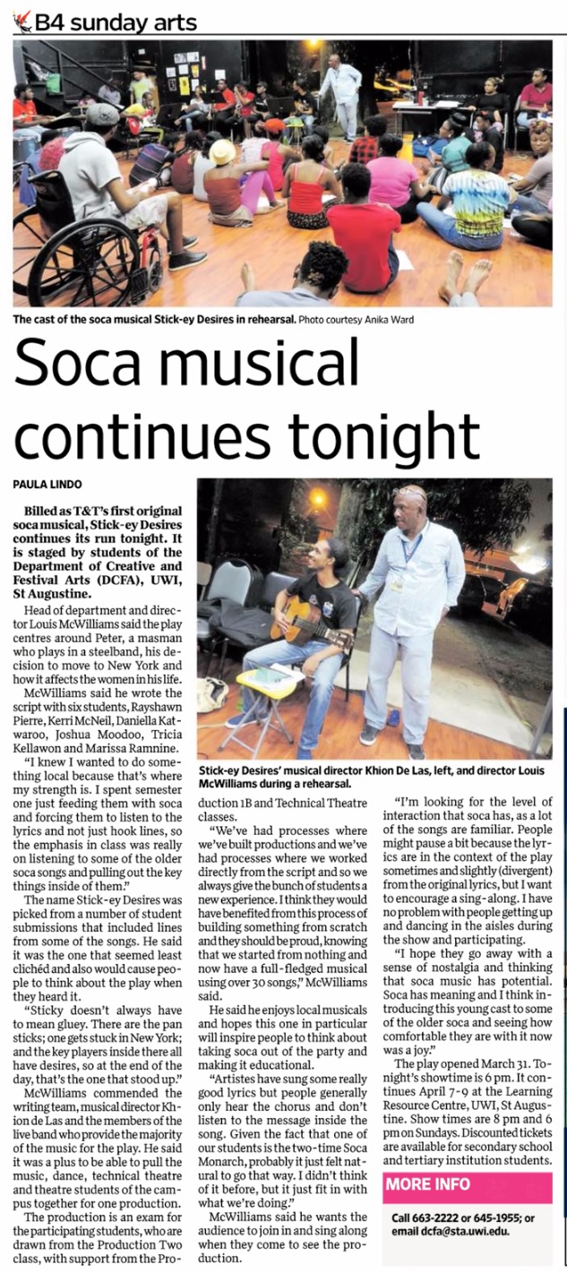 T&T’s first original soca musical, Stick-ey Desires, will be performed this April by students of the Department of Creative and Festival Arts (DCFA), UWI St. Augustine. Head of Department and Director Louis McWilliams said the play centers around Peter, a mas-man who plays in a steel band, his decision to move to New York and how it affects the women in his life.
