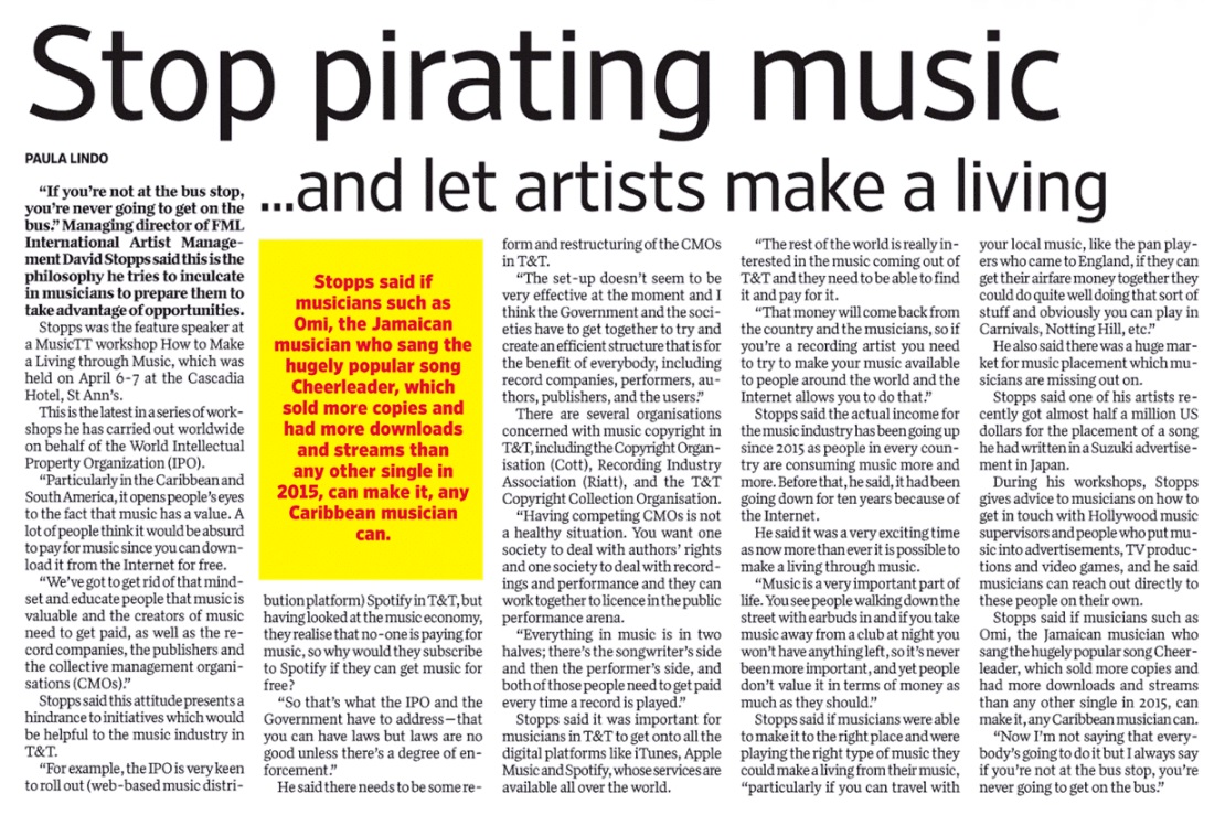 Stopps was recently the feature speaker at a Music TT workshop titled “How to Make a Living through Music,” held on April 6 and 7. This is the latest in a series of workshops he has carried out worldwide on behalf of the World Intellectual Property Organization. “Particularly in the Caribbean and South America, it opens people’s eyes to the fact that music has a value. A lot of people think it would be absurd to pay for music since you can download it from the Internet for free. We’ve got to get rid of that mindset and educate people that music is valuable and the creators of music need to get paid, as well as the record companies, the publishers and the Content Management Organizations.”