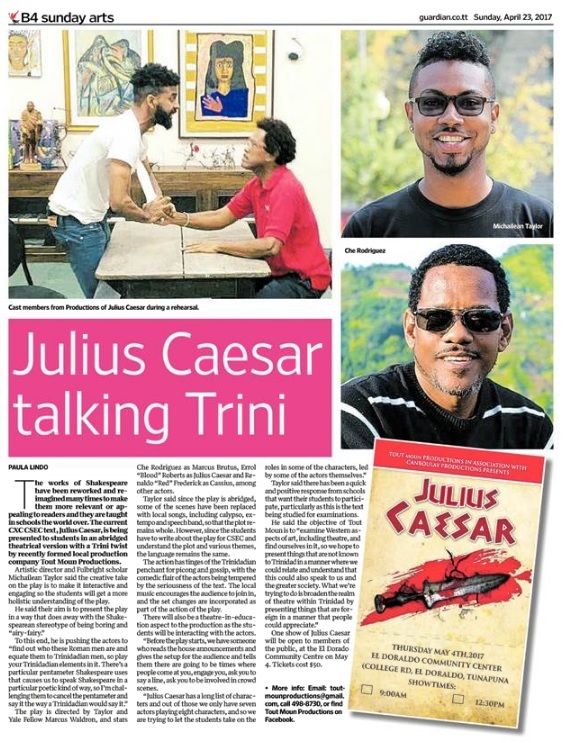 The works of Shakespeare have been reworked and reimagined many times to make them more relevant/appealing to readers, and they are taught in schools the world over. The current CXC text, Julius Caesar, is being presented to students in an abridged theatrical version with a Trini twist by recently formed local production company, Tout Moun Productions.