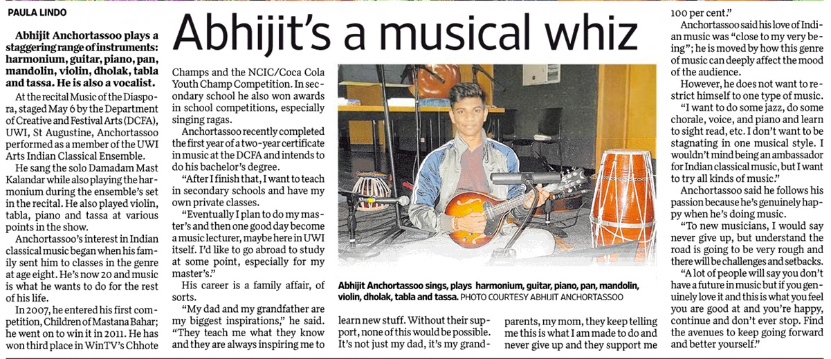 Anchortassoo said his love of Indian music comes from the way it is put out to the world. “We have over 200 compositions, ragas we call them and you can sing and create. If people are feeling happy, you can sing a sad composition and everyone becomes sad, it’s basically a spectrum of emotions from these compositions that really impacts and hits people deeply. It’s basically because of the diversification and the deepness of the music, it’s really deep and to me it’s something that’s close to my very being, I love it.” However, he said he does not want to constrict himself to one type of music. “I want to do some jazz, do some chorale, voice, and piano and learn to sight read, etc. I don’t want to be stagnating in one musical style, even though Indian classical music is pretty uncommon outside of India and Trinidad. I wouldn’t mind being an ambassador for Indian classical music, but I want to try all kinds of music.”