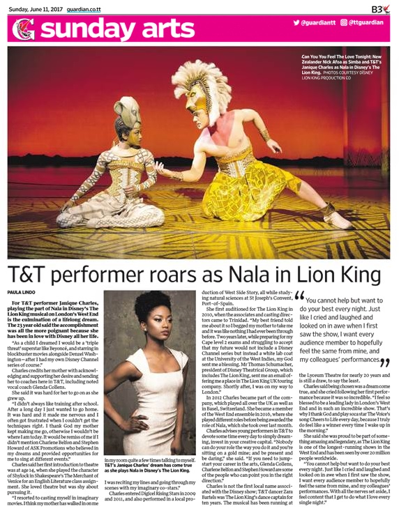 For Trinidadian Janique Charles, playing the part of Nala in Disney’s The Lion King musical on London’s West End is the culmination of a life-long dream. The 23-year-old said the accomplishment is all the more poignant because she has been in love with Disney all her life.