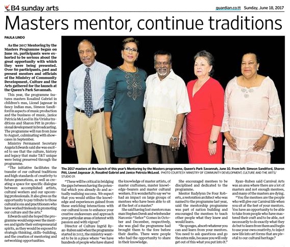 As the 2017 Mentoring by the Masters Program began on June 10, participants were exhorted to be serious about the great opportunity they are being presented with. Over 80 participants, past and present mentors and officials of the Ministry of Community Development, Culture and the Arts gathered for the launch at the Queen’s Park Savannah.