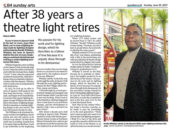 Now that he has retired, Whiskey said he wants to pass his knowledge on to the next generation, as there is a lack of people who want to be electricians and/or lighting designers. “I think it’s a lack of the drive and people like myself to drill it into the youth to look at the theatre as an option because you can earn money. For the last six years, I’ve been saying I want to go back and teach, whether UWI, UTT or some school or even if I open my own and get the authorization and whatever to just impart what I learned over the years.”